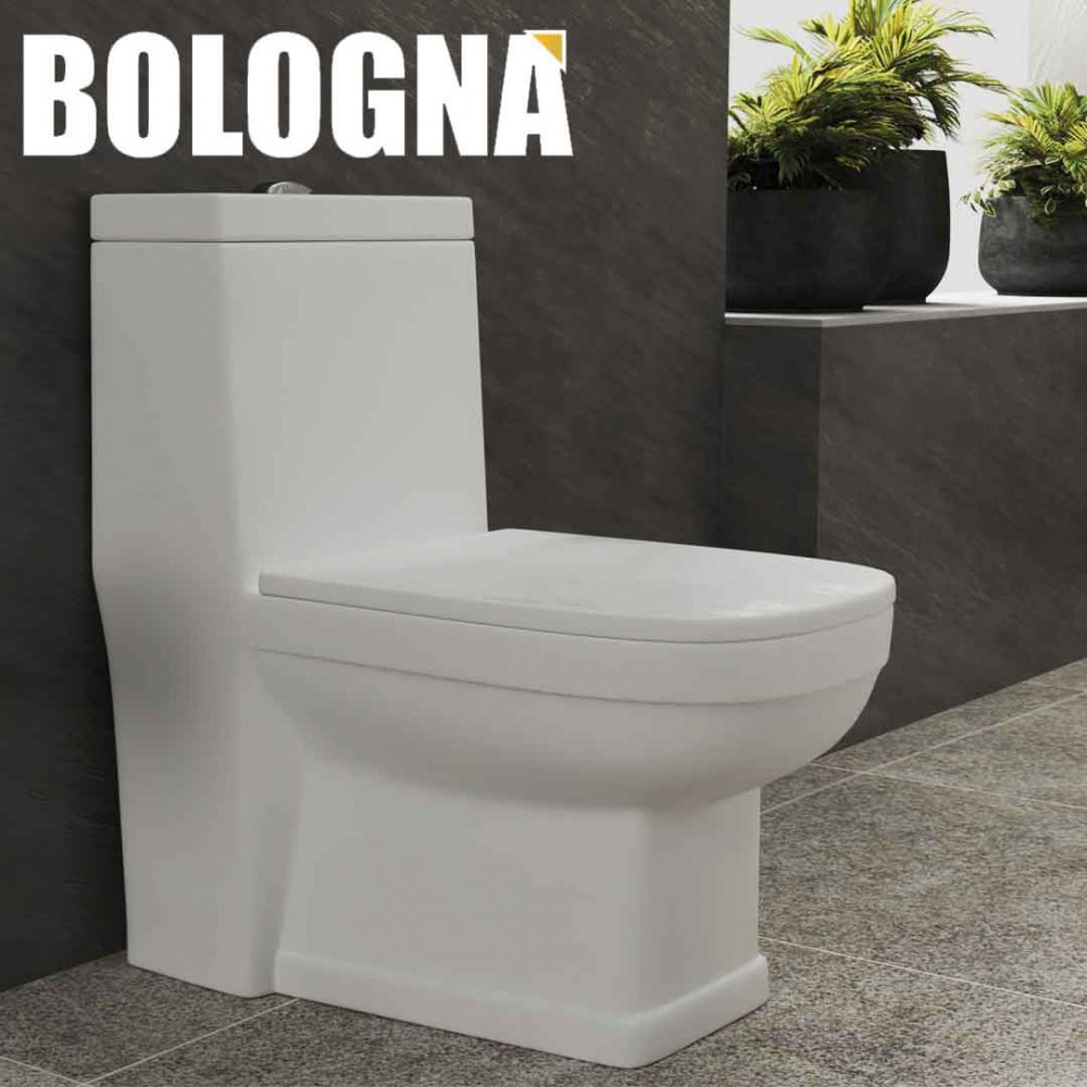 توالت فرنگی بلونیا: دارای لعاب آنتی باکتریال-لعاب کاری داخل تانک ومجرای خروجی-سیستم تخلیه سوپرجت4.5 لیتری-فلاش دوزمانه-درب آرام بند جداشونده